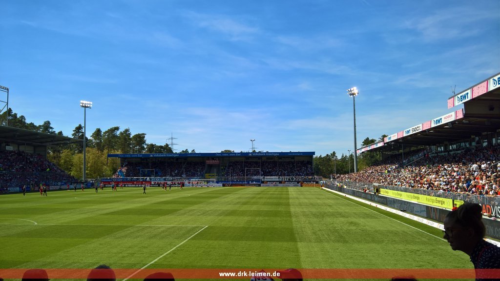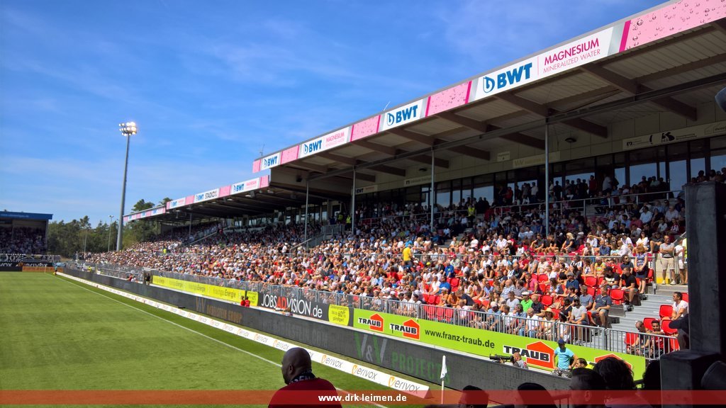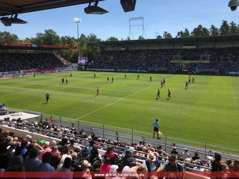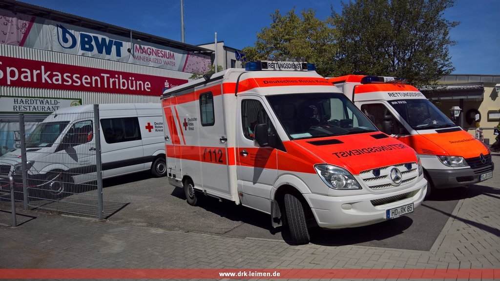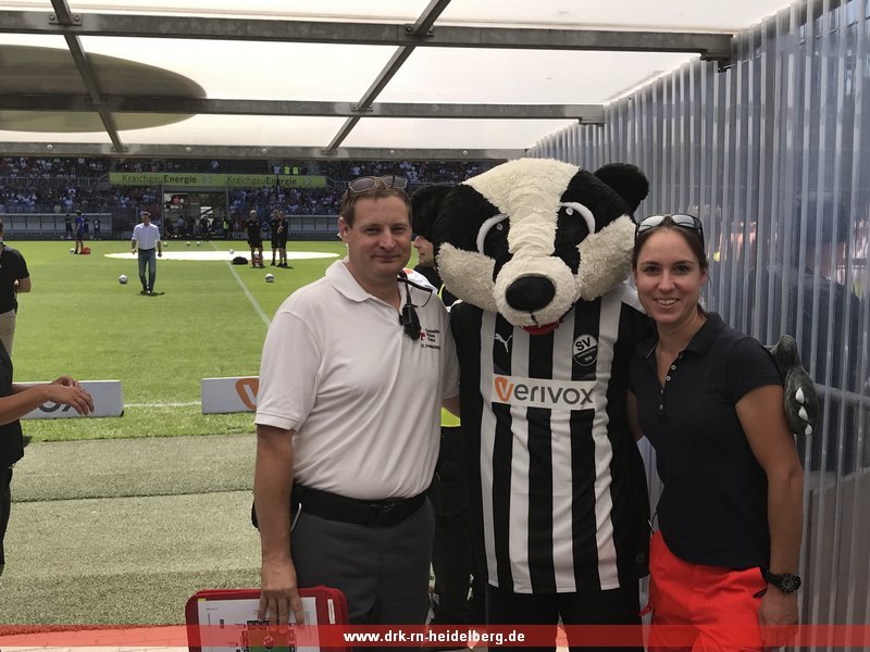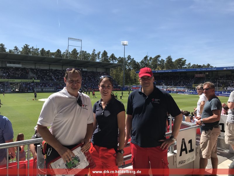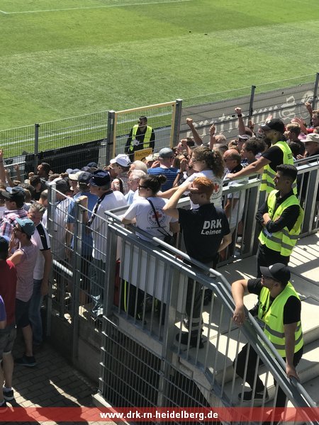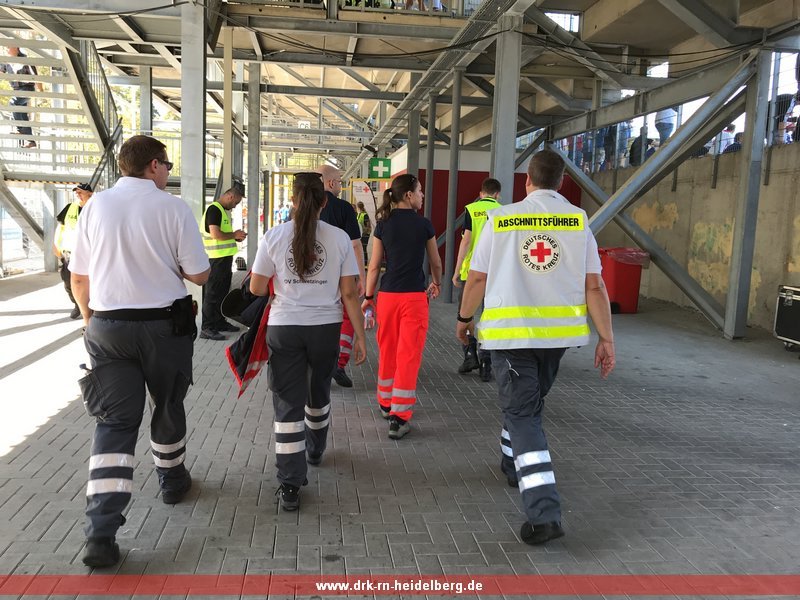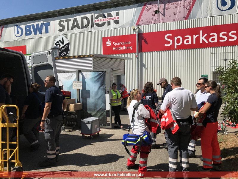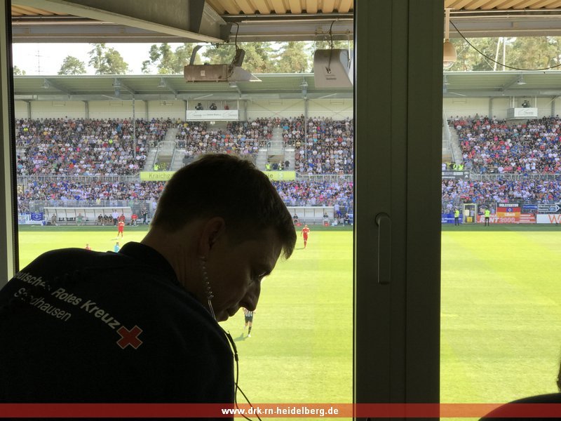 Bei der Einsatzbesprechung um 11 Uhr morgens im DRK Sandhausen stellt sich den Sanitätern das Szenario so dar: Erstes Heimspiel des SV Sandhausen in der Zweitliga-Saison 2018/2019, der Hamburger SV kommt, ausverkaufte Hütte. Rund 14.000 Fans erwarten die Einsatzkräfte, davon 7000 Hamburger Auswärtsfans. Als Risikospiel zählt die Begegnung nicht, die Gefahrenlage besteht eher wegen des erhöhten Verkehrsaufkommens und den hohen Temperaturen von 30 Grad bei strahlender Sonne. Vor Ort ist das Rote Kreuz mit zwei Notärzten und 32 Helferinnen und Helfern – unterstützt von Kollegen aus den Ortsvereinen Schwetzingen, Dossenheim, Heidelberg-Nord, Rauenberg, Leimen, Mannheim-Friedrichsfeld, Walldorf, Angelbachtal, Mühlhausen und Steinachtal. Sie alle engagieren sich ehrenamtlich. In ihrer Freizeit leisten sie medizinische Versorgung für die Stadionbesucher, statt den Sonntag am See oder im Garten zu verbringen. Die meisten Fans danken es Ihnen.