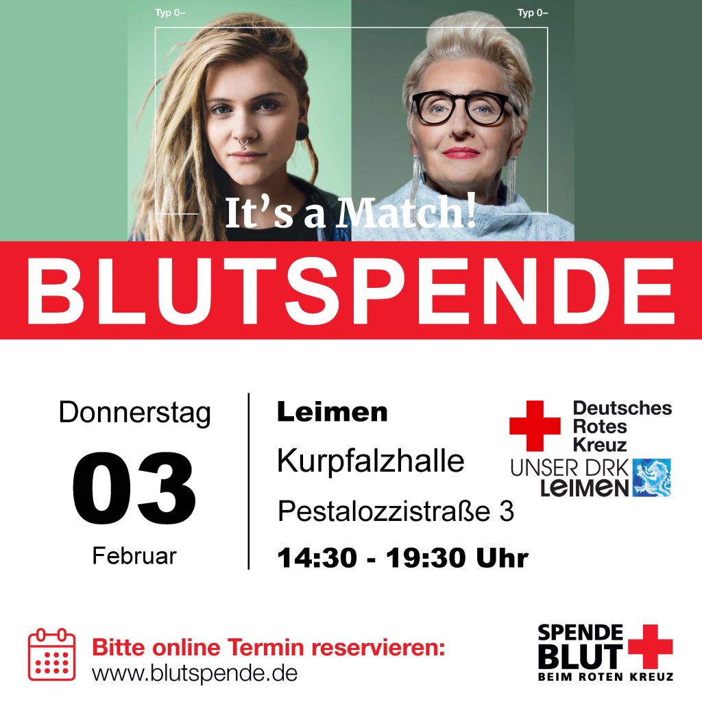 Am 3. Februar zwischen 14:30 und 19:30 Uhr laden der Blutspendedienst Baden-Württemberg/Hessen und das DRK Leimen in die Kurpfalzhalle St. Ilgen zur Winterblutspende. Gerade in der anhaltenden Pandemielage sind Blutspenden sind sehr wichtig für die Aufrechterhaltung der medizinischen Versorgung. Bitte beachten Sie, dass die Blutspendeaktion...
