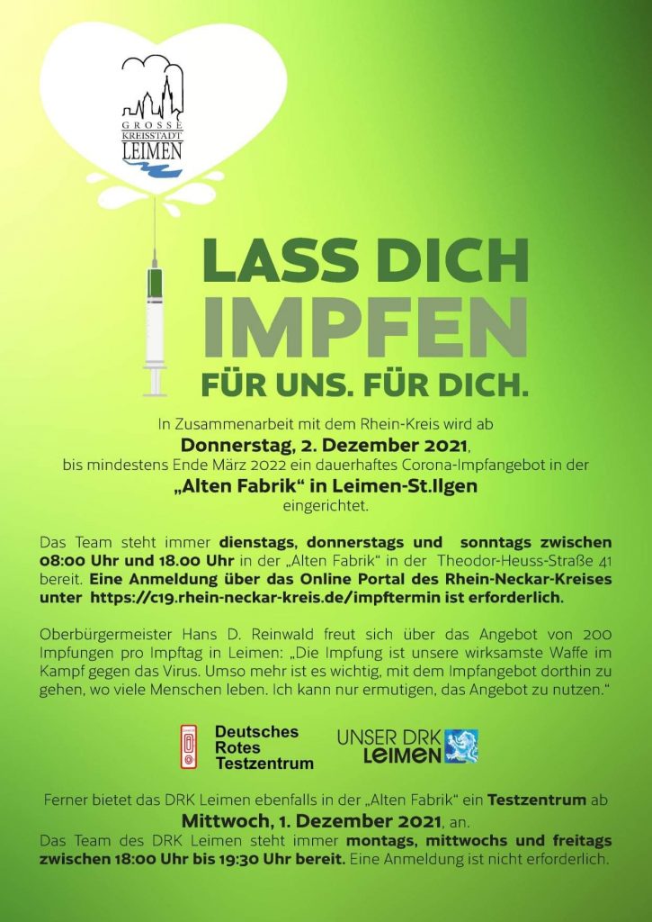 Am 1. Dezember öffnet das Kommunale Schnelltestzentrum wieder seine Pforten. Witterungsbedingt wurde ein Gebäude gesucht, das hierfür geeignet ist. Hier konnte die alte Fabrik in St. Ilgen gefunden werden, in der auch das Dauerhafte Impfangebot (DIA) des Rhein-Neckar-Kreises unter kommt. So finden Montag, Mittwoch und Freitag von 18 bis 19:30...