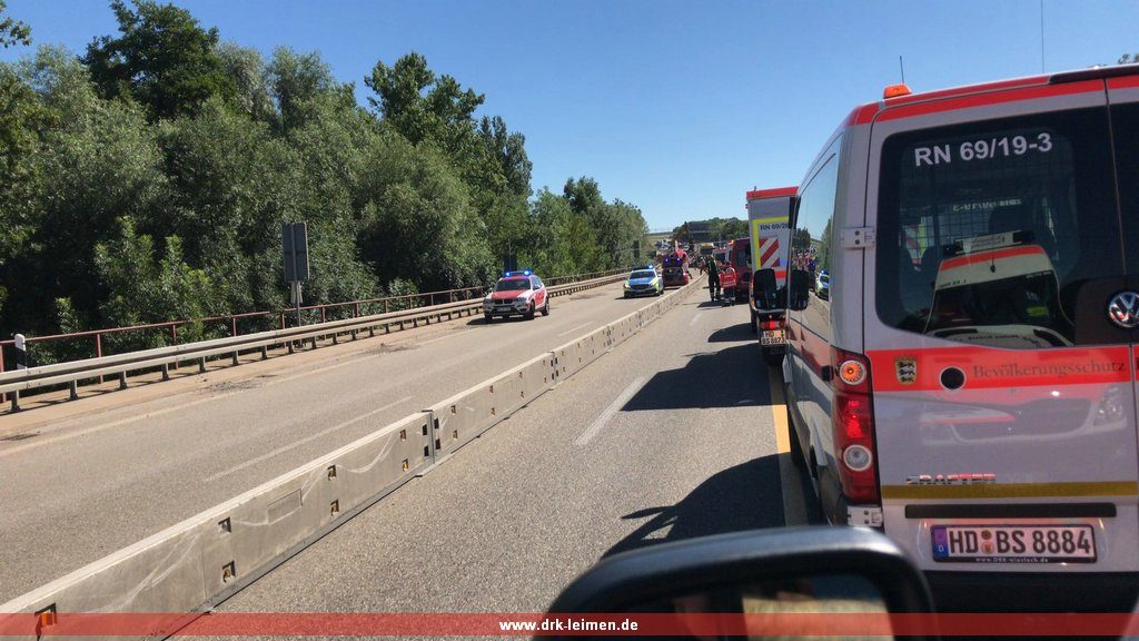 Großeinsatz für DRK-Einsatzkräfte – LKW fährt auf der A6 bei Wiesloch auf vollbesetzten Reisebus auf